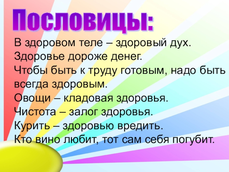 Пословицы: В здоровом теле – здоровый дух. Здоровье дороже денег. Чтобы быть к труду готовым, надо быть
