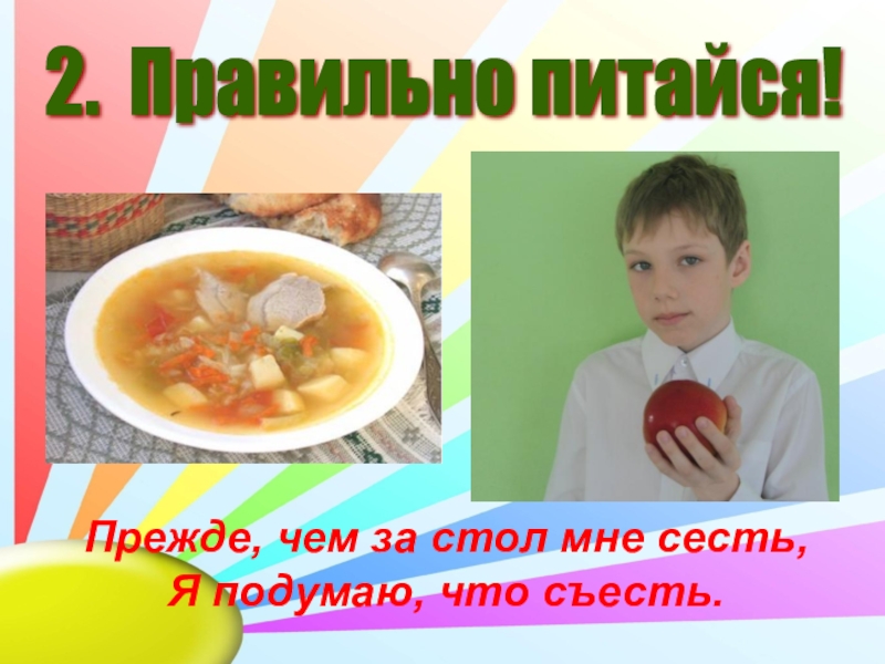 2. Правильно питайся! Прежде, чем за стол мне сесть,Я подумаю, что съесть.