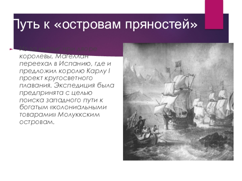 Путь к «островам пряностей»Из-за интриг при дворе королевы, Магеллан переехал в Испанию, где и предложил королю Карлу
