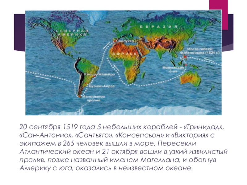 Слайд 420 сентября 1519 года 5 небольших кораблей - «Тринидад», «Сан-Антонио», «Сантьяго»,