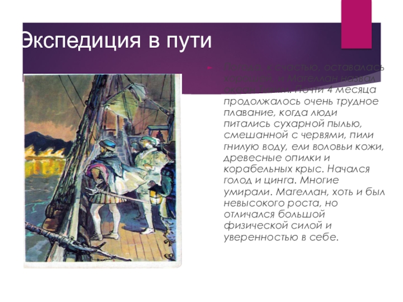 Тихим. Почти 4 месяца продолжалось очень трудное плавание, когда люди питались сухарной пылью, смешанной с червями, пили гнилую воду, ели воловьи кожи, древесные опилки и корабельных крыс. Начался голод и цинга. Многие умирали. Магеллан, хоть и был невысокого роста, но отличался большой физической силой и уверенностью в себе.