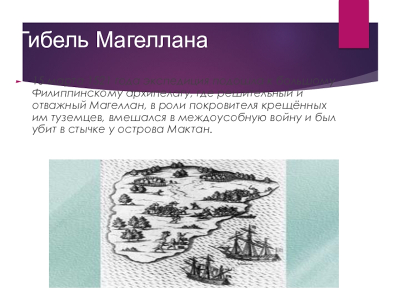 Гибель Магеллана15 марта 1521 года экспедиция подошла к большому Филиппинскому архипелагу, где решительный и отважный Магеллан, в