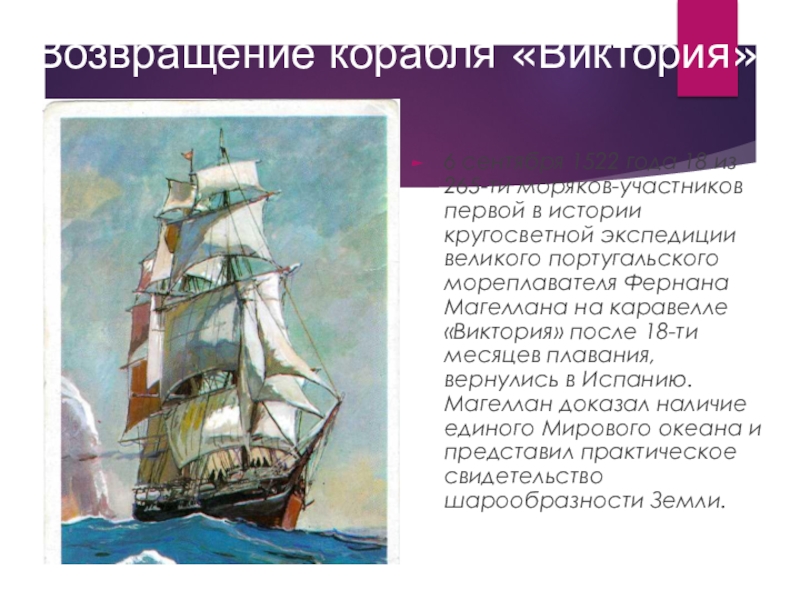 в истории кругосветной экспедиции великого португальского мореплавателя Фернана Магеллана на каравелле «Виктория» после 18-ти месяцев плавания, вернулись в Испанию. Магеллан доказал наличие единого Мирового океана и представил практическое свидетельство шарообразности Земли.