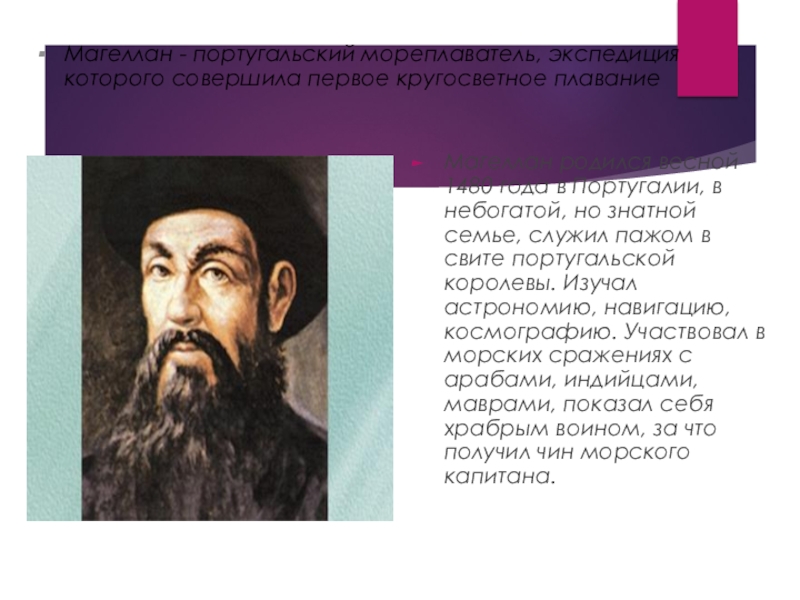 Магеллан - португальский мореплаватель, экспедиция которого совершила первое кругосветное плавание Магеллан родился весной 1480 года в Португалии, в небогатой, но знатной семье, служил пажом в свите португальской королевы. Изучал астрономию, навигацию, космографию. Участвовал в морских сражениях