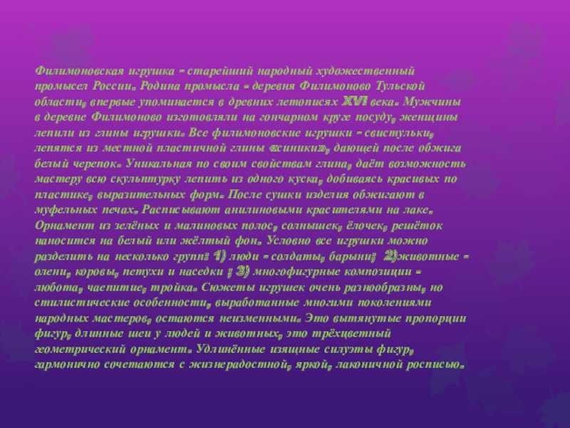 Слайд 2Филимоновская игрушка - старейший народный художественный промысел России. Родина промысла - деревня