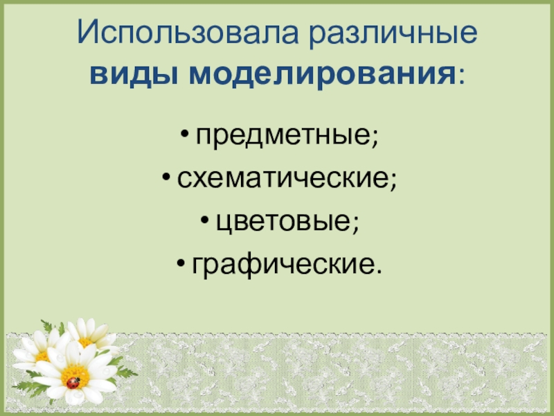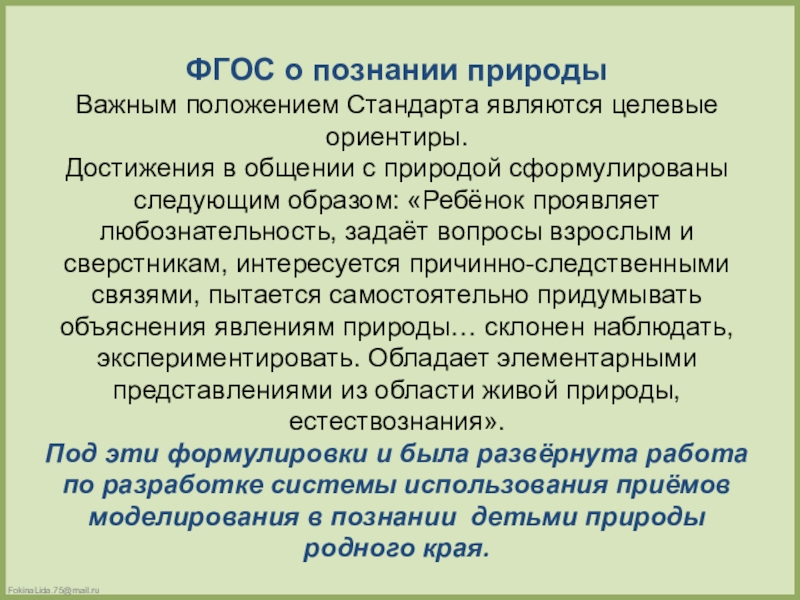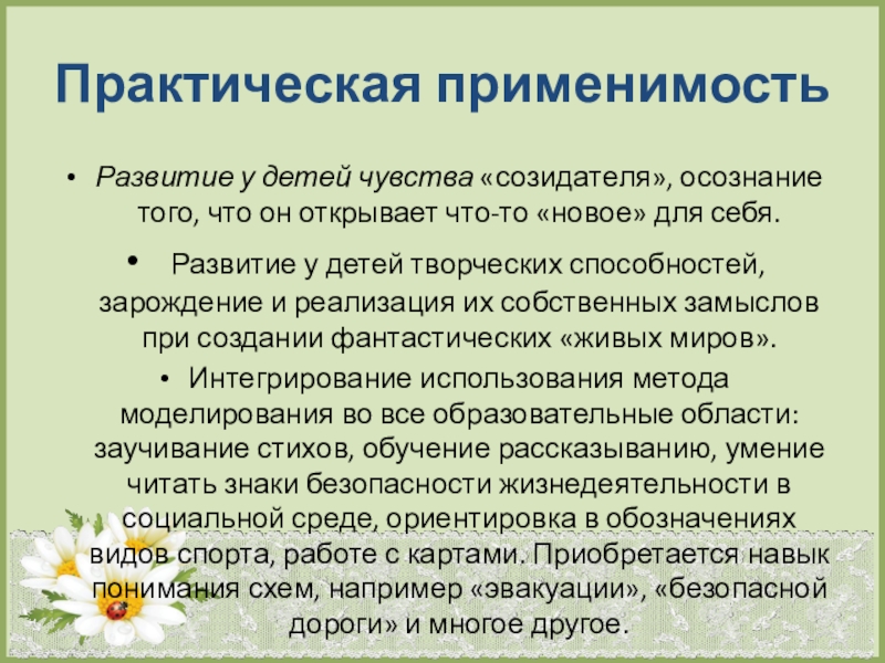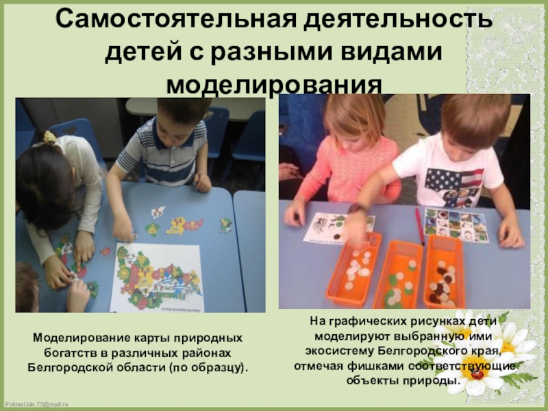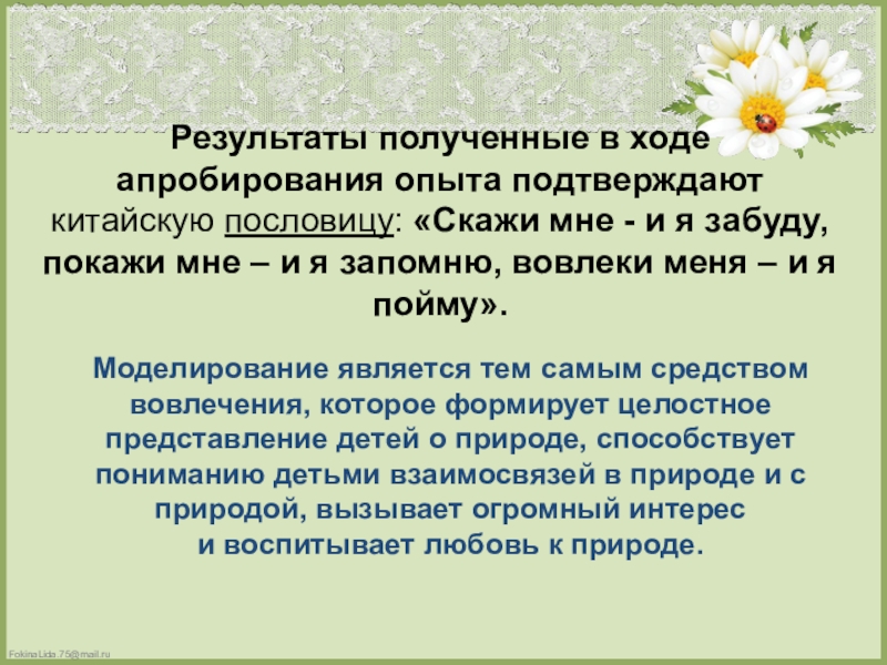 Моделирование является тем самым средством вовлечения, которое формирует целостное представление детей о природе, способствует пониманию детьми взаимосвязей в природе и с природой, вызывает огромный интерес и воспитывает любовь к природе.