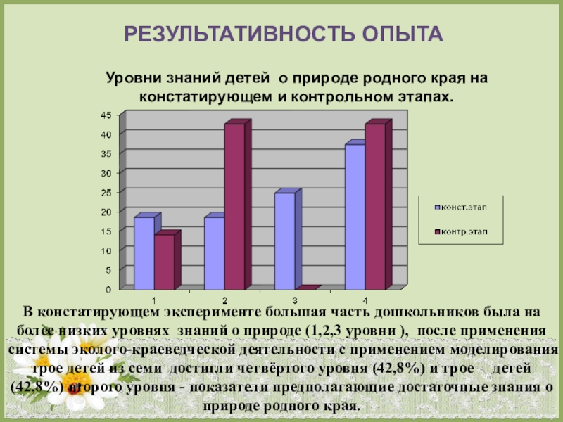 В констатирующем эксперименте большая часть дошкольников была на более низких уровнях знаний о природе (1,2,3 уровни ), после применения системы эколого-краеведческой деятельности с применением моделирования трое детей из семи достигли четвёртого уровня (42,8%) и трое детей (42,8%) второго уровня - показатели предполагающие достаточные знания о природе родного края.