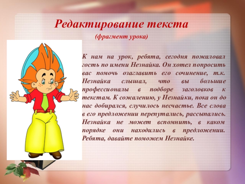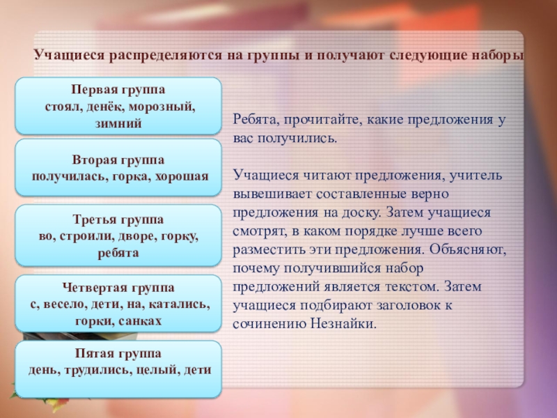 Учащиеся читают предложения, учитель вывешивает составленные верно предложения на доску. Затем учащиеся смотрят, в каком порядке лучше всего разместить эти предложения. Объясняют, почему получившийся набор предложений является текстом. Затем учащиеся подбирают заголовок к сочинению Незнайки.
