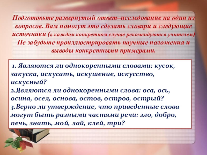 1. Являются ли однокоренными словами: кусок, закуска, искусать, искушение, искусство, искусный?
