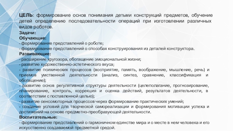 узнают о свойствах деталей строительного материала, овладевают техникой создания робота, учатся определять его основные части, устанавливать их пространственное расположение, выделять детали.