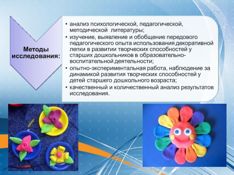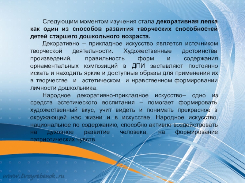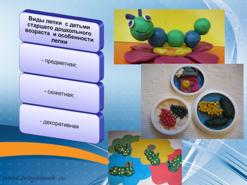Слайд 11 Следующим моментом изучения стала декоративная лепка как один из способов развития