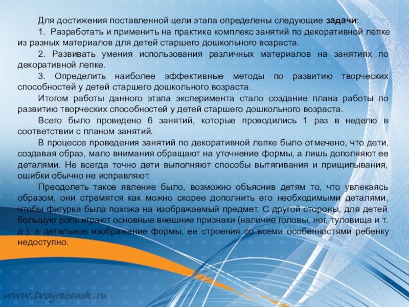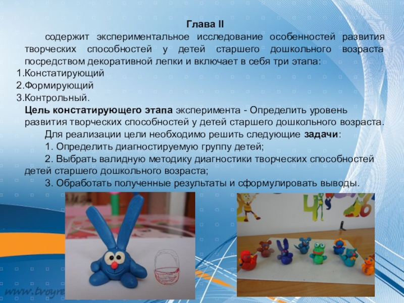 5. Провести экспериментальное исследование особенностей развития творческих способностей у детей старшего дошкольного возраста по средствам декоративной лепки.