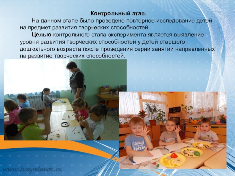 Целью контрольного этапа эксперимента является выявление уровня развития творческих способностей у детей старшего дошкольного возраста после проведения серии занятий направленных на развитие творческих способностей.