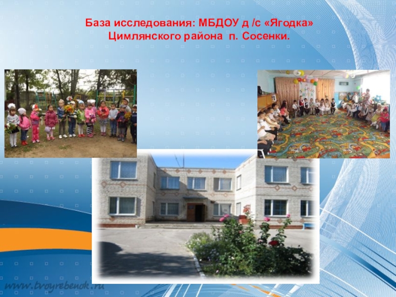Слайд 9База исследования: МБДОУ д /с «Ягодка» Цимлянского района п. Сосенки.