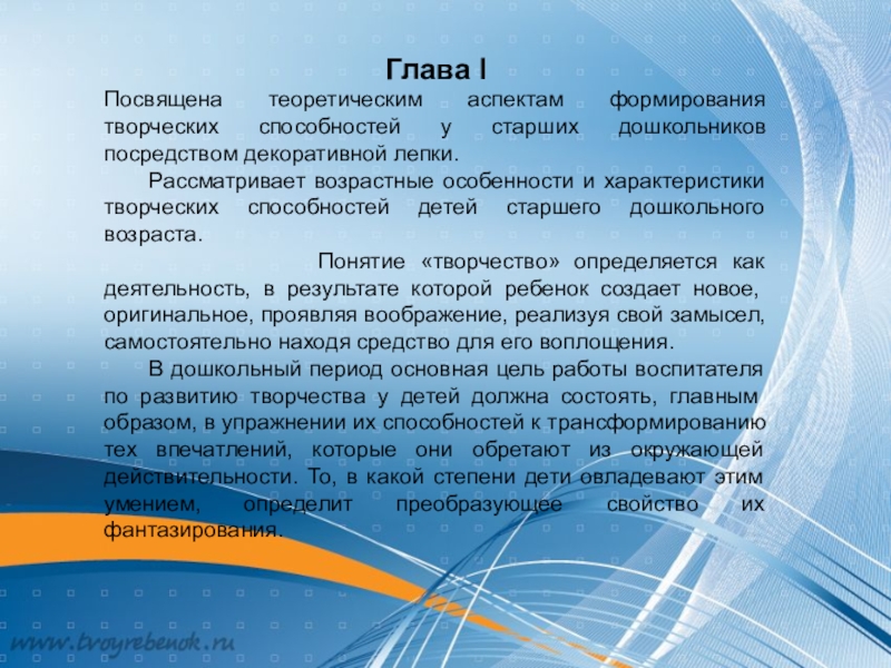 Посвящена теоретическим аспектам формирования творческих способностей у старших дошкольников посредством