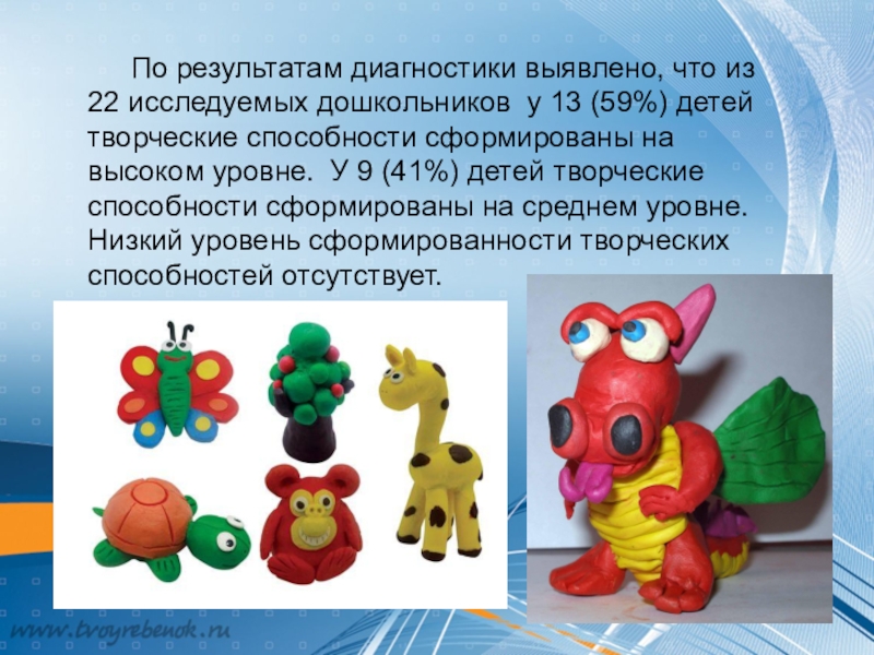 (59%) детей творческие способности сформированы на высоком уровне. У 9 (41%) детей творческие способности сформированы на среднем уровне. Низкий уровень сформированности творческих способностей отсутствует.