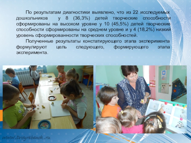 Слайд 23 По результатам диагностики выявлено, что из 22 исследуемых дошкольников у 13