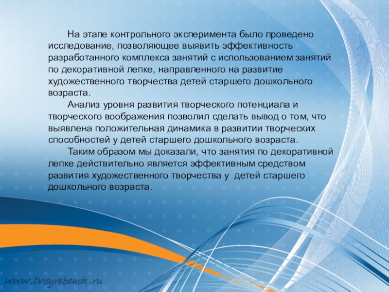 Таким образом мы доказали, что занятия по декоративной лепке действительно является эффективным средством развития художественного творчества у детей старшего дошкольного возраста.