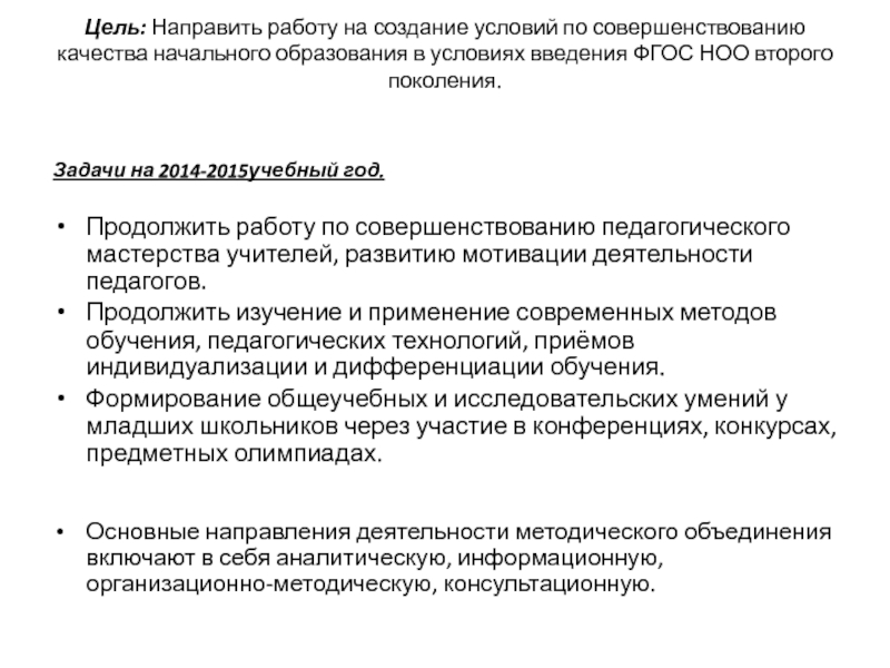 Основные направления деятельности методического объединения включают в себя аналитическую, информационную, организационно-методическую, консультационную.