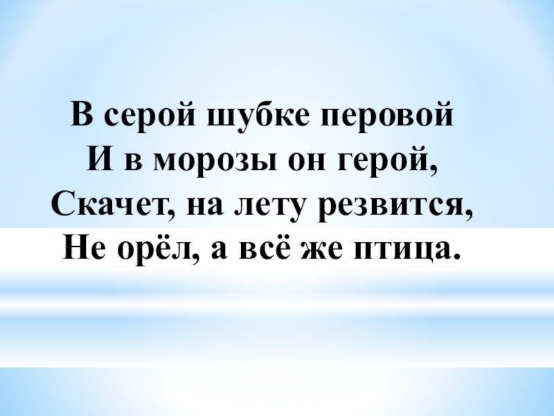 Слайд 5В серой шубке перовой И в морозы он герой, Скачет, на лету резвится, Не