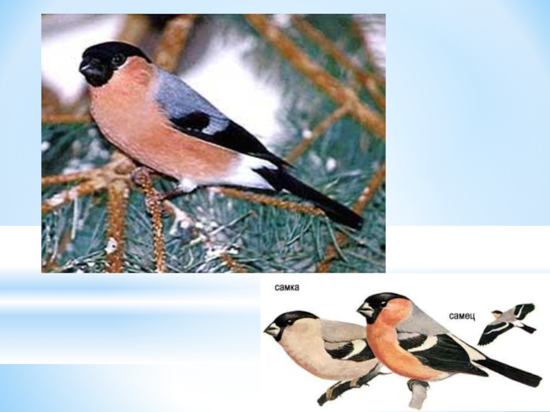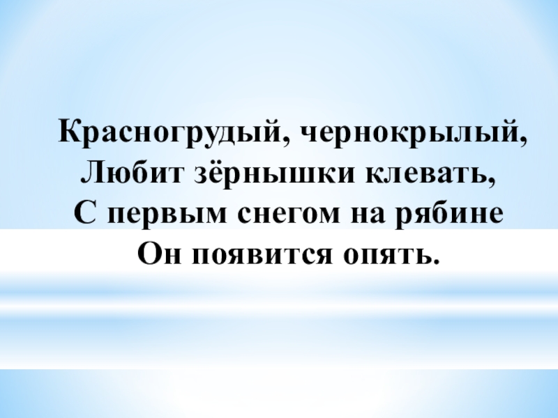 Слайд 9Красногрудый, чернокрылый, Любит зёрнышки клевать, С первым снегом на рябине Он появится опять.