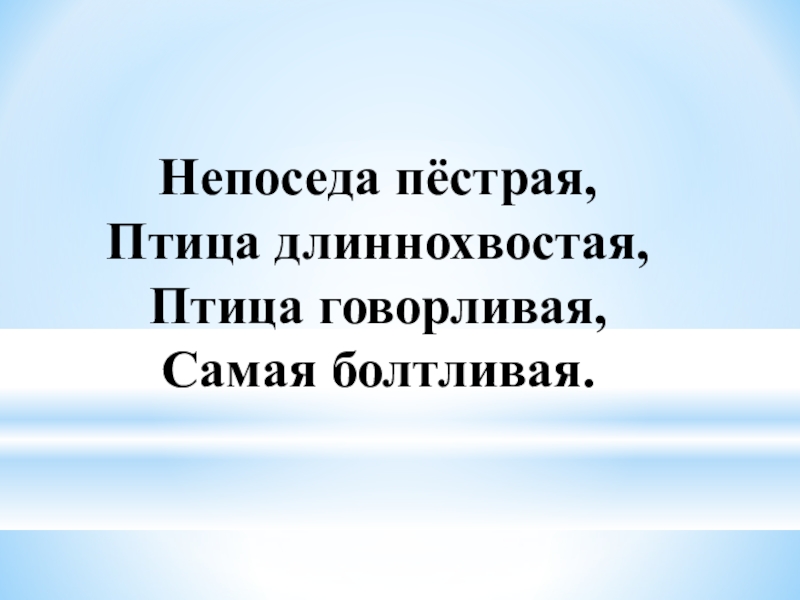 Слайд 11Непоседа пёстрая, Птица длиннохвостая, Птица говорливая, Самая болтливая.
