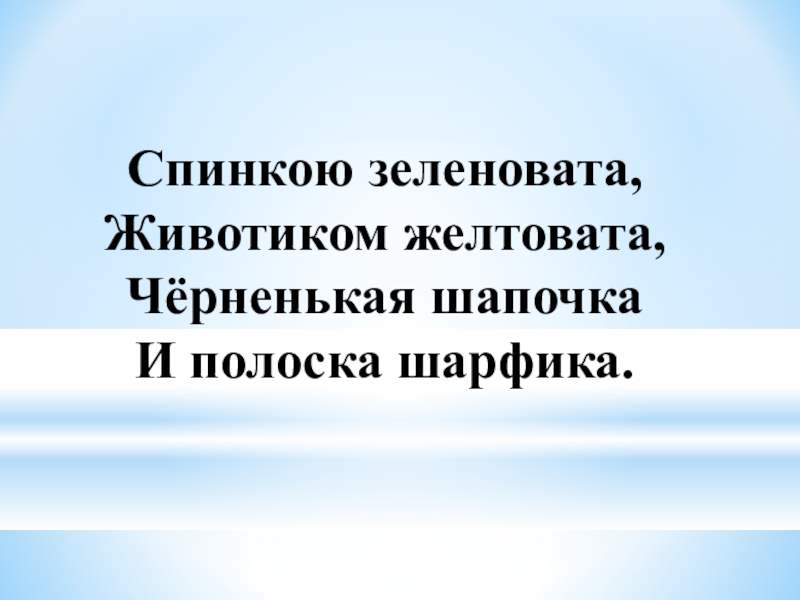 Слайд 3 Спинкою зеленовата, Животиком желтовата, Чёрненькая шапочка И полоска шарфика.
