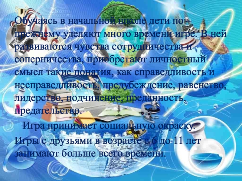 игре. В ней развиваются чувства сотрудничества и соперничества, приобретают личностный смысл такие понятия, как справедливость и несправедливость, предубеждение, равенство, лидерство, подчинение, преданность, предательство.