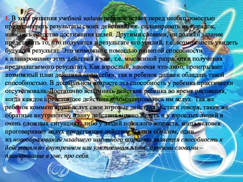 действий, т.е. спланировать их порядок, наметить средства достижения целей. Другими словами, он должен заранее представить то, что получится в результате его усилий, т.е. возможность увидеть будущий результат. Это возможно с помощью развитой способности к планированию этих действий в уме, т.е. мысленной разработки получения предполагаемого результата. Как взрослый, намечая что-либо, проигрывает возможный план действий «про себя», так и ребенок должен обладать такой способностью. В дошкольном возрасте эта способность у ребенка практически отсутствовала. Достаточно вспомнить действия ребенка во время рисования, когда каждое предстоящее действие комментировалось им вслух. Так же ребенок комментирует вслух свои игровые действия. Кстати говоря, такие же обратные внутреннему плану действия можно видеть и у взрослых людей в очень сложных ситуациях, либо у людей пожилого возраста, когда человек проговаривает вслух предстоящее действие. Таким образом, один из новообразований младшего школьного возраста является способность к действиям во внутреннем или умственном плане, другими словами – планирование в уме, про себя.