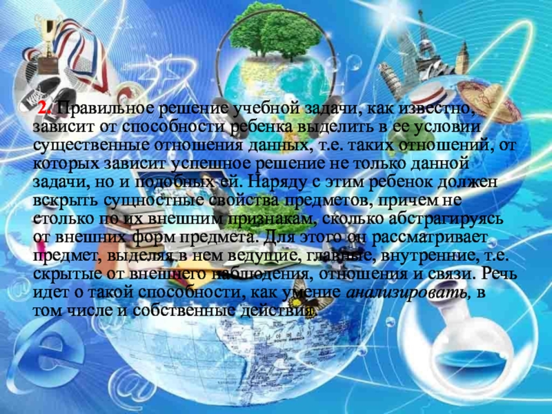 ребенка выделить в ее условии существенные отношения данных, т.е. таких отношений, от которых зависит успешное решение не только данной задачи, но и подобных ей. Наряду с этим ребенок должен вскрыть сущностные свойства предметов, причем не столько по их внешним признакам, сколько абстрагируясь от внешних форм предмета. Для этого он рассматривает предмет, выделяя в нем ведущие, главные, внутренние, т.е. скрытые от внешнего наблюдения, отношения и связи. Речь идет о такой способности, как умение анализировать, в том числе и собственные действия.