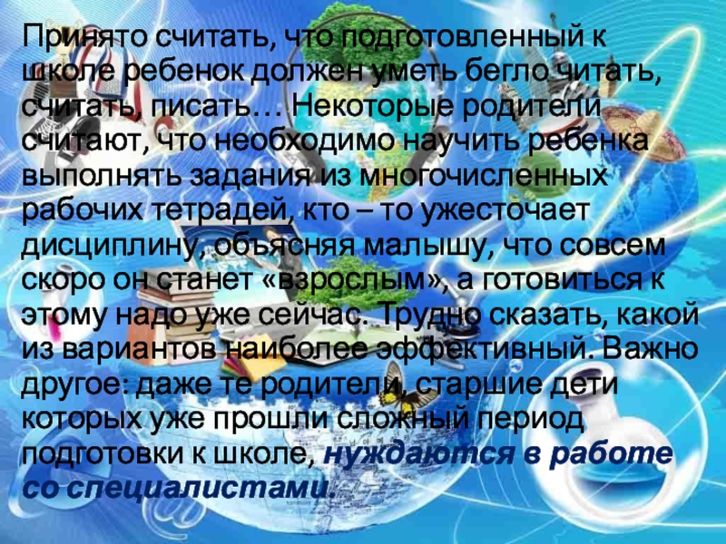 Слайд 29Принято считать, что подготовленный к школе ребенок должен уметь бегло читать,