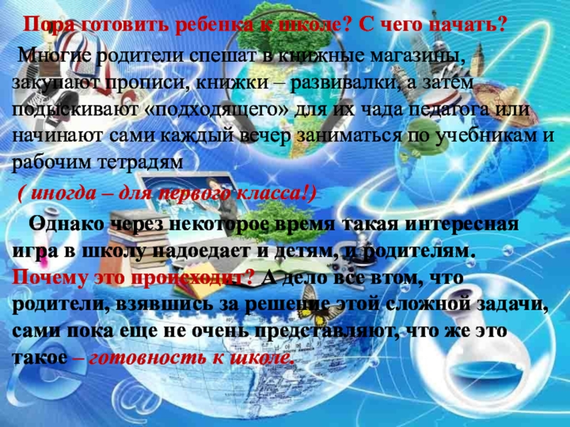 Однако через некоторое время такая интересная игра в школу надоедает и детям, и родителям. Почему это происходит? А дело все втом, что родители, взявшись за решение этой сложной задачи, сами пока еще не очень представляют, что же это такое – готовность к школе.