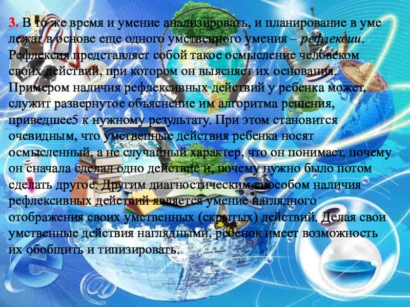 уме лежат в основе еще одного умственного умения – рефлексии. Рефлексия представляет собой такое осмысление человеком своих действий, при котором он выясняет их основания. Примером наличия рефлексивных действий у ребенка может, служит развернутое объяснение им алгоритма решения, приведшее5 к нужному результату. При этом становится очевидным, что умственные действия ребенка носят осмысленный, а не случайный характер, что он понимает, почему он сначала сделал одно действие и, почему нужно было потом сделать другое. Другим диагностическим способом наличия рефлексивных действий является умение наглядного отображения своих умственных (скрытых) действий. Делая свои умственные действия наглядными, ребенок имеет возможность их обобщить и типизировать.