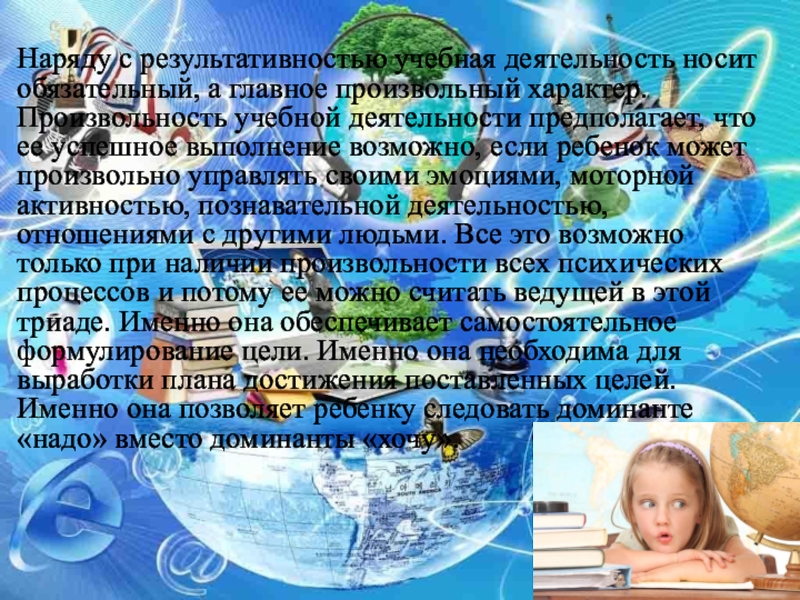 Слайд 9Наряду с результативностью учебная деятельность носит обязательный, а главное произвольный характер.