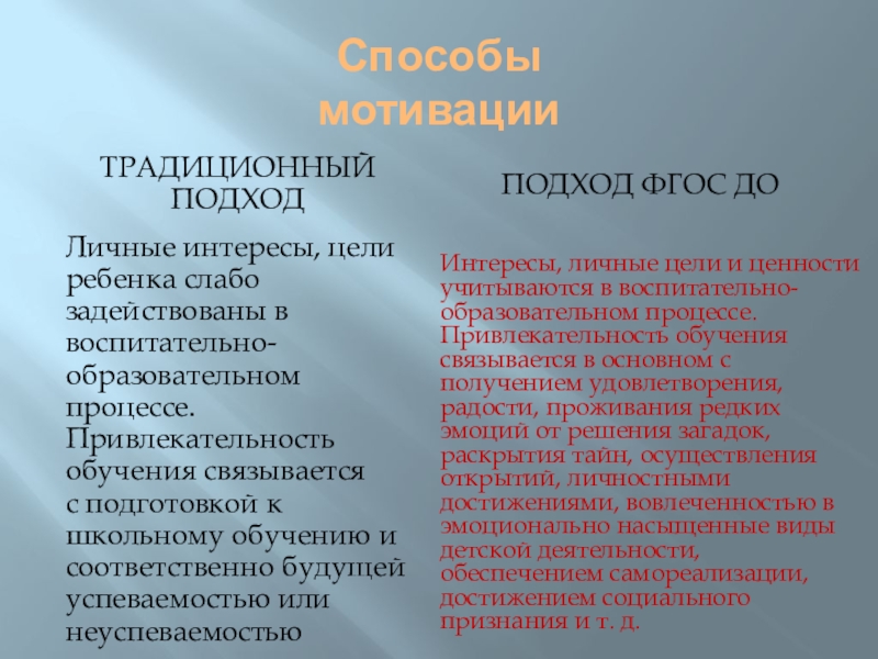 Интересы, личные цели и ценности учитываются в воспитательно-образовательном процессе. Привлекательность обучения связывается в основном с получением удовлетворения, радости, проживания редких эмоций от решения загадок, раскрытия тайн, осуществления открытий, личностными достижениями, вовлеченностью в эмоционально насыщенные виды детской деятельности, обеспечением самореализации, достижением социального признания и т. д.