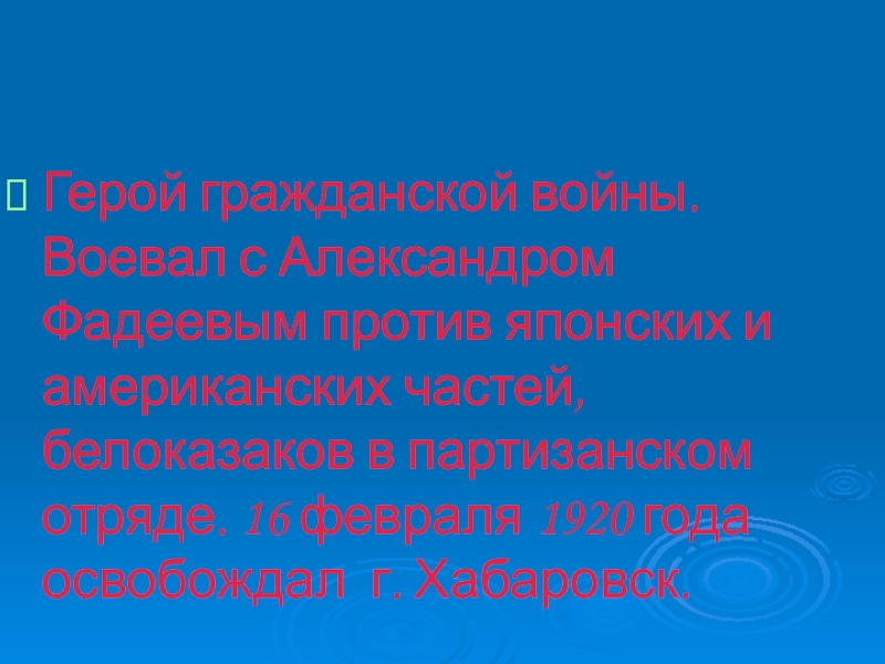 Слайд 9Герой гражданской войны. Воевал с Александром Фадеевым против японских и американских
