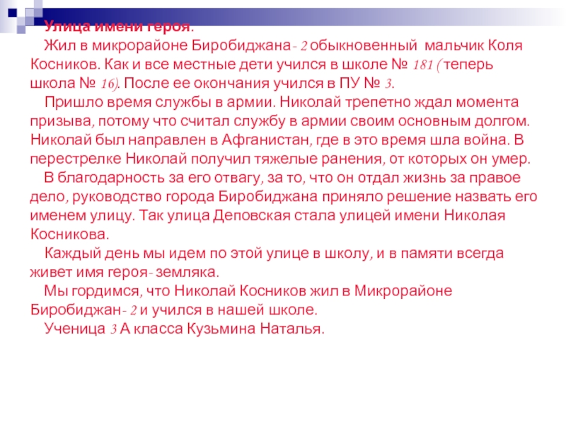 Мы гордимся, что Николай Косников жил в Микрорайоне Биробиджан- 2 и учился в нашей школе.