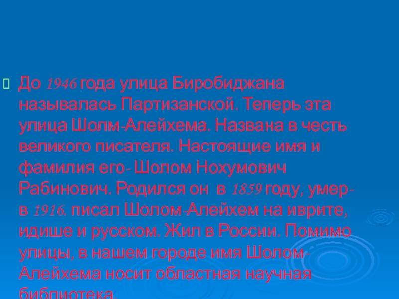 Слайд 16До 1946 года улица Биробиджана называлась Партизанской. Теперь эта улица Шолм-Алейхема.