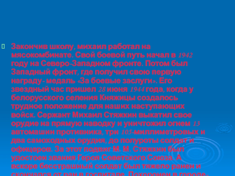 1942 году на Северо-Западном фронте. Потом был Западный фронт, где получил свою первую награду- медаль «За боевые заслуги». Его звездный час пришел 28 июня 1944 года, когда у белорусского селения Княжицы создалось трудное положение для наших наступающих войск. Сержант Михаил Стяжкин выкатил свое орудие на прямую наводку и уничтожил огнем 13 автомашин противника, три 105-миллиметровых и два самоходных орудия, до полуроты солдат и офицеров. За этот подвиг М. М. Стяжкин был удостоен звания Героя Советского Союза. А вскоре бесстрашный солдат был тяжело ранен и скончался от ран в госпитале. Похоронен в городе-герое Бресте в братской могиле.