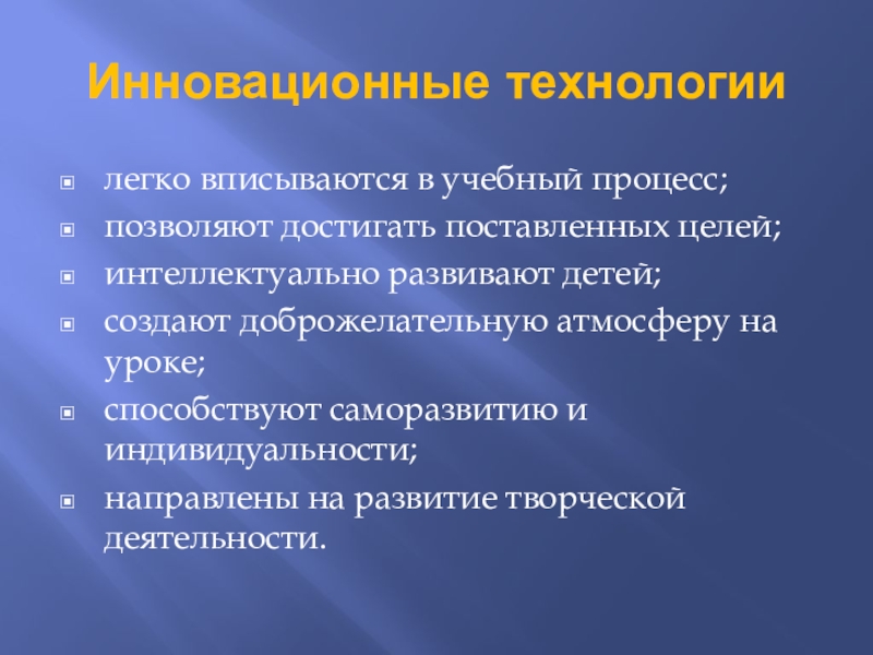 Инновационные технологиилегко вписываются в учебный процесс;позволяют достигать поставленных целей;интеллектуально развивают детей;создают доброжелательную атмосферу на уроке;способствуют саморазвитию и
