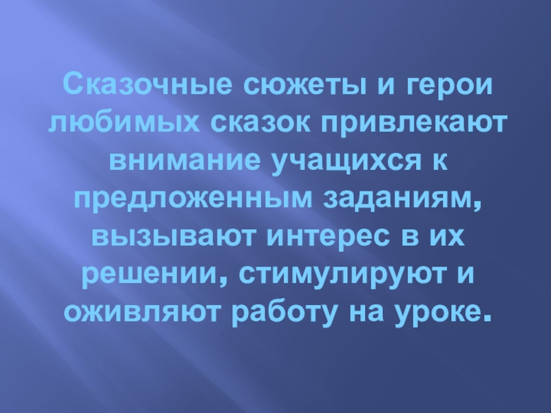 Слайд 12Сказочные сюжеты и герои любимых сказок привлекают внимание учащихся к предложенным