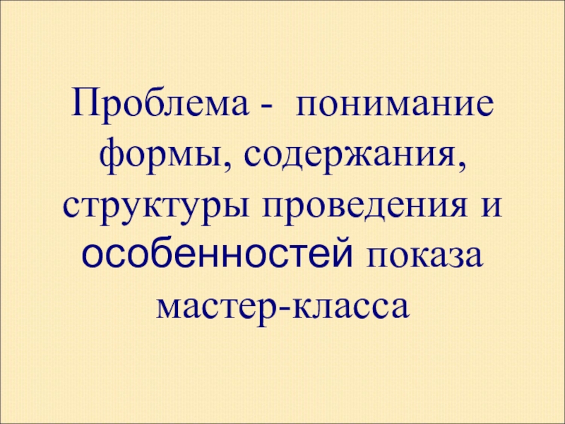 Слайд 2Проблема - понимание формы, содержания, структуры проведения и особенностей показа мастер-класса