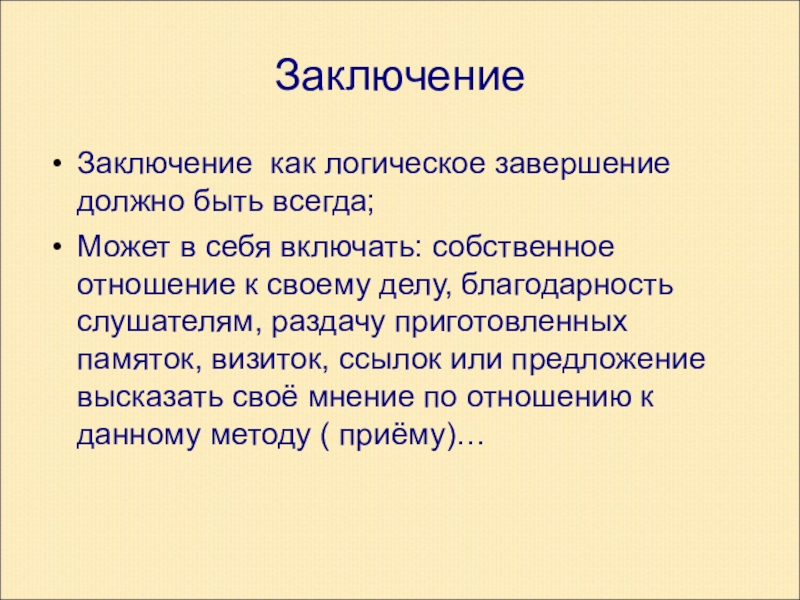 собственное отношение к своему делу, благодарность слушателям, раздачу приготовленных памяток, визиток, ссылок или предложение высказать своё мнение по отношению к данному методу ( приёму)…
