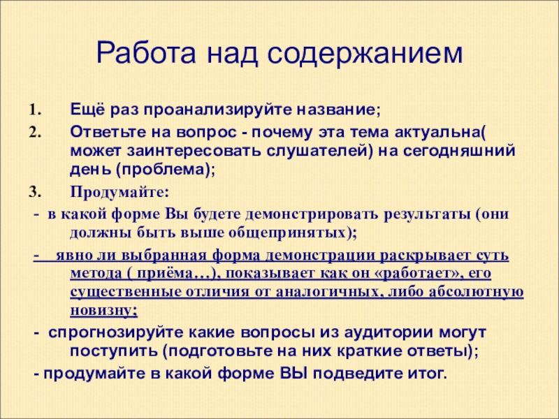 - спрогнозируйте какие вопросы из аудитории могут поступить (подготовьте на них краткие ответы);