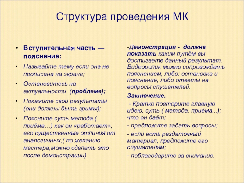До демонстрации, расскажите участникам МК на что Вы хотели бы обратить их внимание;