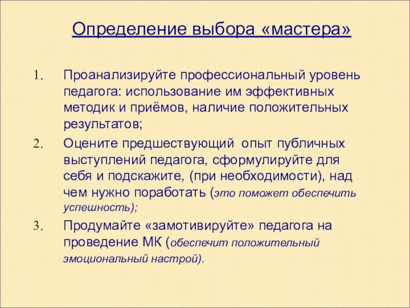 Продумайте «замотивируйте» педагога на проведение МК (обеспечит положительный эмоциональный настрой).