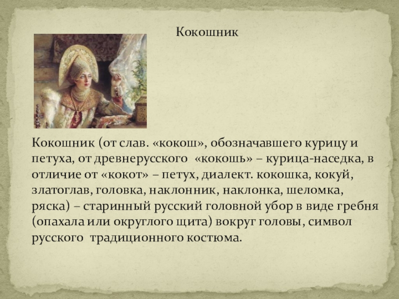 Кокошник (от слав. «кокош», обозначавшего курицу и петуха, от древнерусского