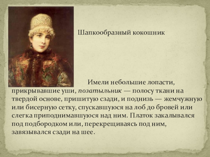 Имели небольшие лопасти, прикрывавшие уши, позатыльник — полосу ткани на твердой основе, пришитую сзади, и поднизь — жемчужную или бисерную сетку, спускавшуюся на лоб до бровей или слегка приподнимавшуюся над ним. Платок закалывался под подбородком или, перекрещиваясь под ним, завязывался сзади на шее.