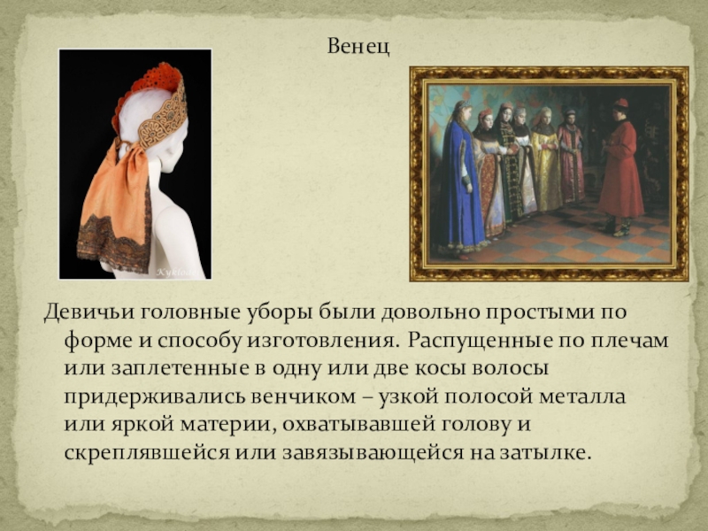 изготовления. Распущенные по плечам или заплетенные в одну или две косы волосы придерживались венчиком – узкой полосой металла или яркой материи, охватывавшей голову и скреплявшейся или завязывающейся на затылке.