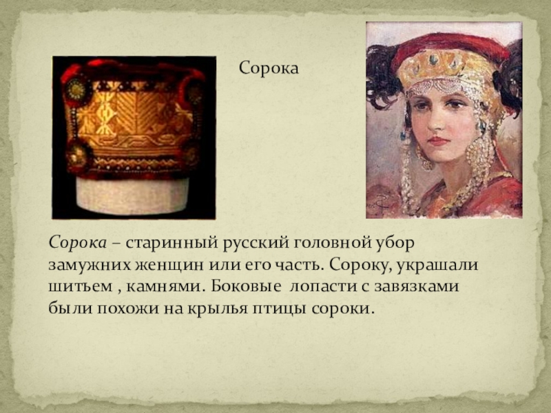 Сорока – старинный русский головной убор замужних женщин или его часть.